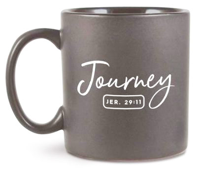 Journey mug displays a Scripture reference to Jeremiah 29:11. Medium gray tone. Holds 16 ox. Microwave and dishwasher safe. Produced by Lighthouse Christian Products.